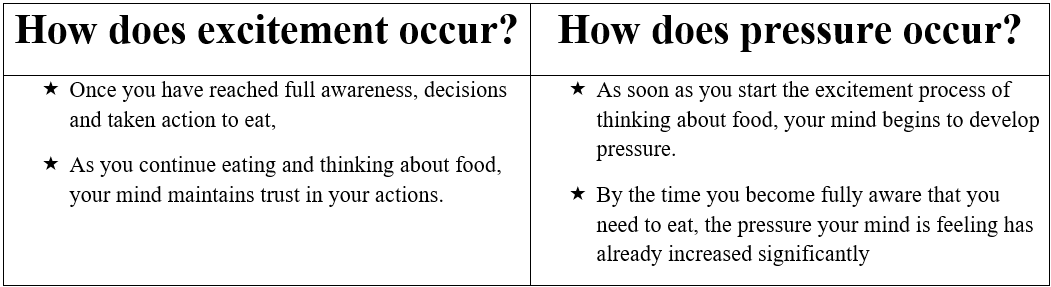 - When you start to feel like “you want to eat”: that is a mood! It’s essential to recognize this process correctly as a response to low energy levels, which defines hunger. There are two types of excitement feelings—moods and desires—before you eat, and there are two types of satisfaction feelings— Paused Low Satiety and Paused full Satiety —after you eat.